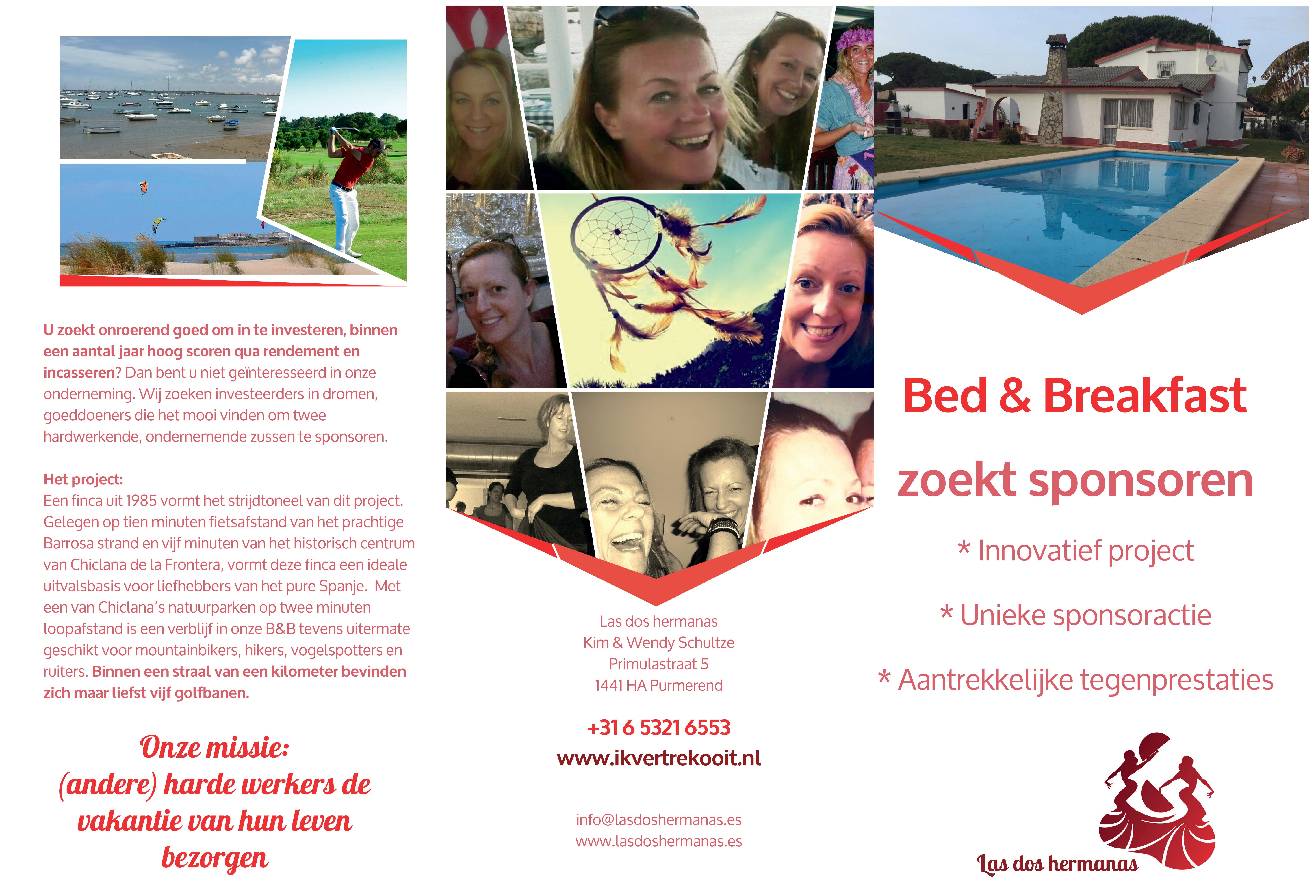 - In ruil voor uw sponsoring maken wij reclame voor uw onderneming op de website en Facebookpagina van Bed & Breakfast Las dos hermanas. Op de homepage komt een ‘mede mogelijk gemaakt door’-banner met logo’s (inclusief hyperlink naar uw website) van alle sponsoren